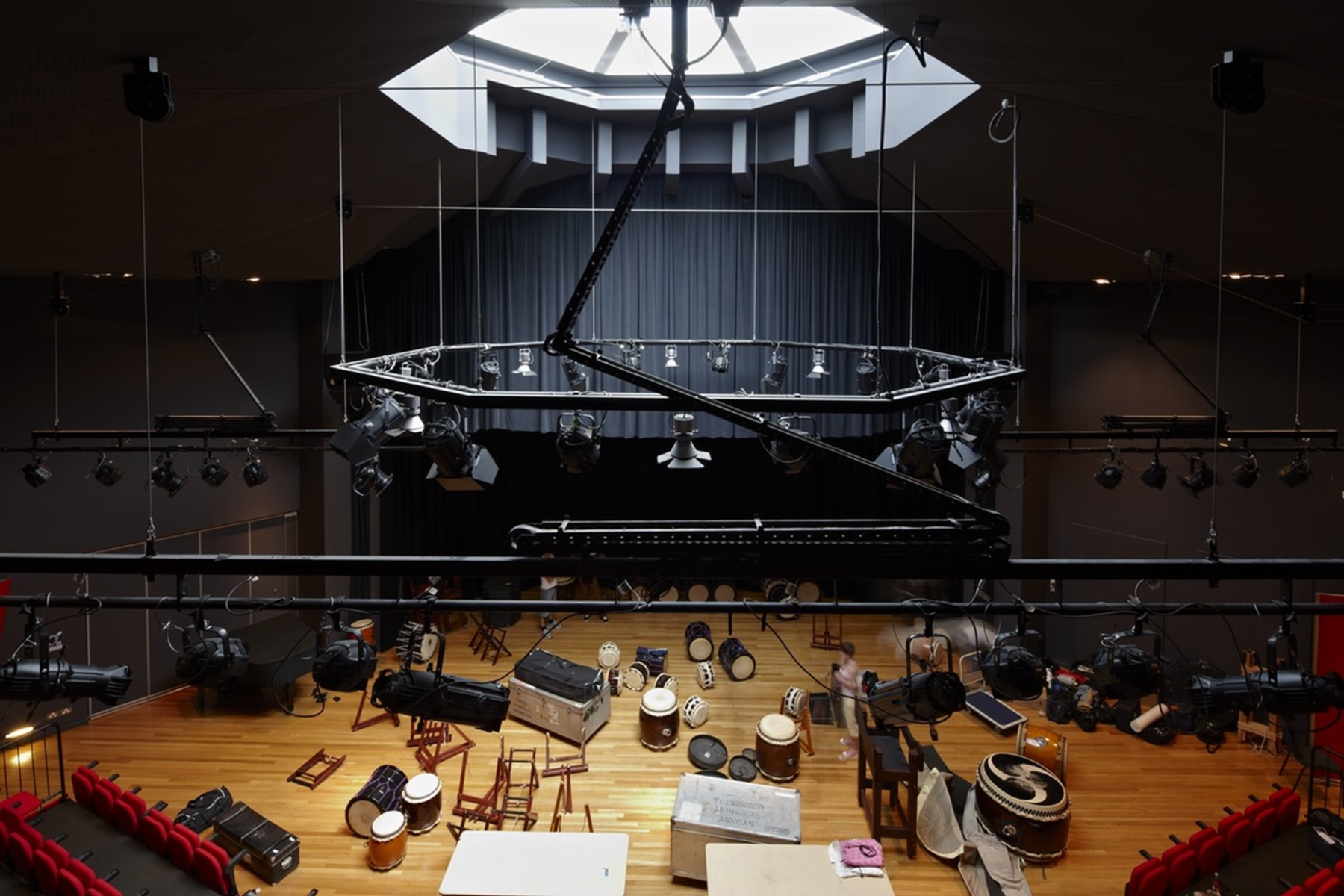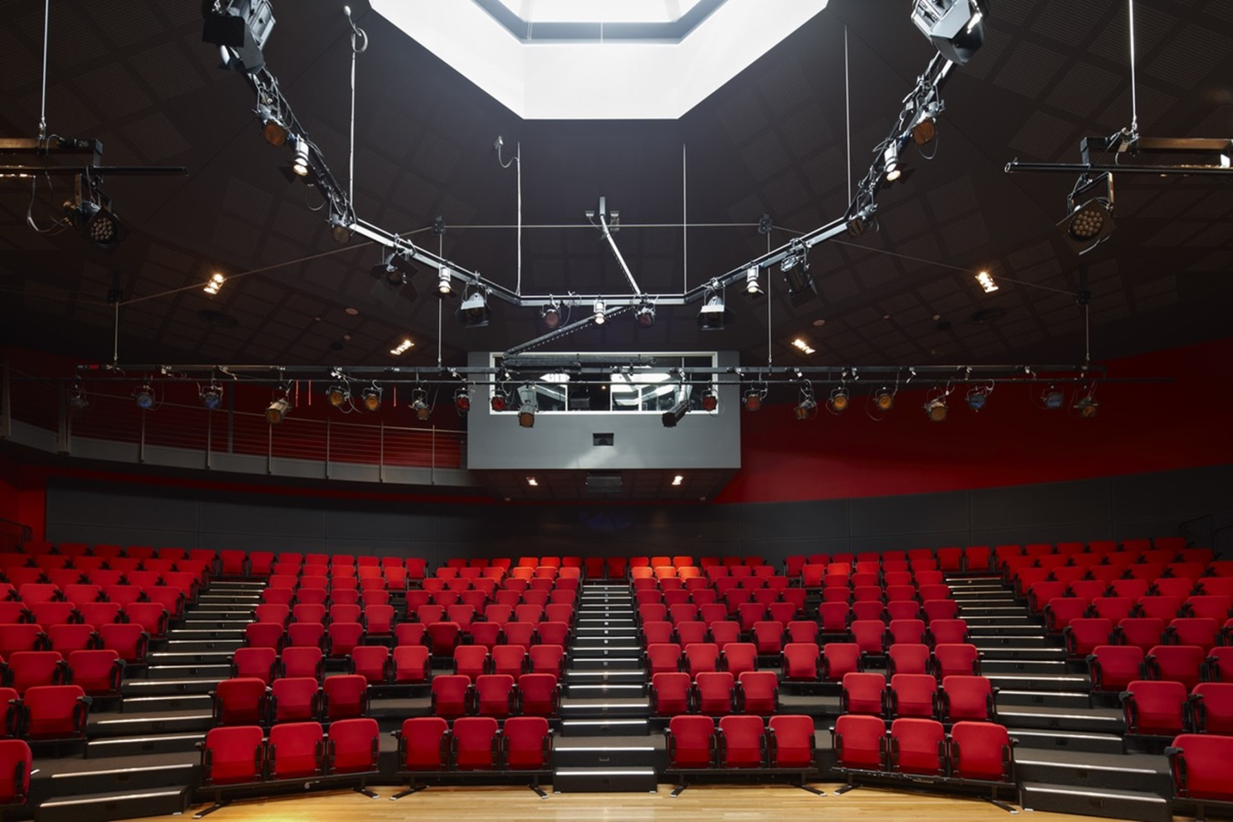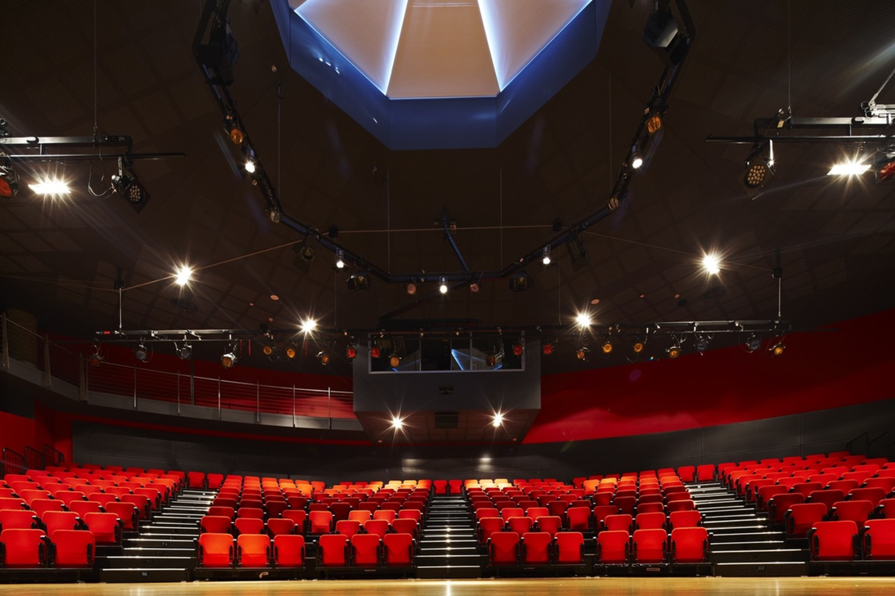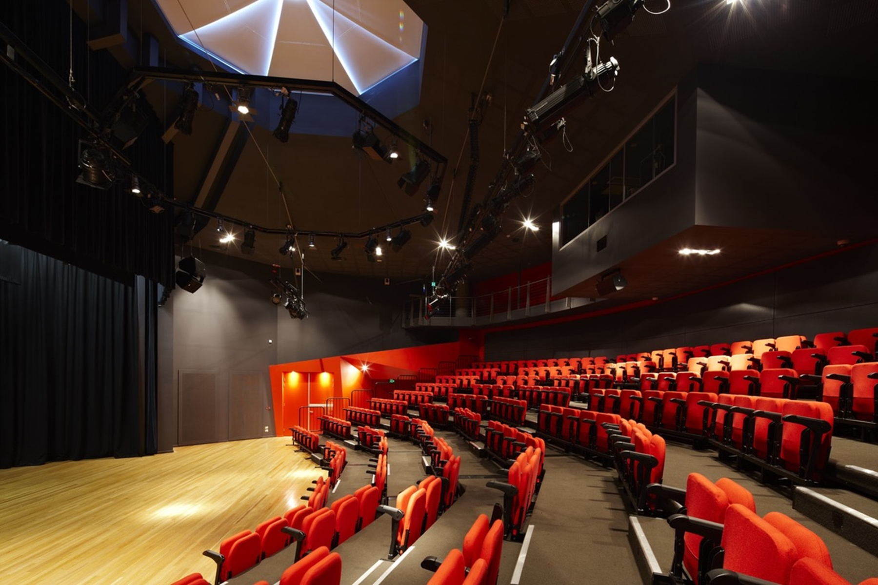 The Cultural Centre includes a 365-seat theatre and auditorium, which features a flat floor layout, retractable seating, and a stage area complete with a proscenium and curtain, allowing for a variety of events, including concerts, recitals, film screenings, fashion shows, and other functions. The theatre’s octagonal design spans two stories, with a central skylight that provides natural light for daytime events. Three-dimensional origami elements integrate the theatre’s interior and foyer areas, creating a cohesive and unique design.